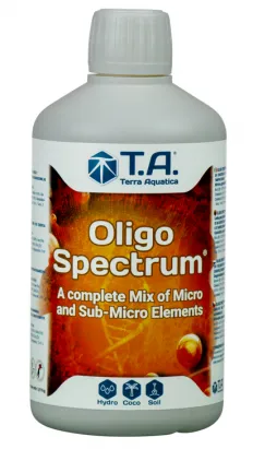 Oligo Spectrum ® é um produto único: uma gama abrangente de micronutrientes concentrados na forma quelatada, além de sub-micro elementos essenciais aplicados com solução tampão orgânica. É utilizado como complemento a solução nutritiva em culturas no solo e na água, bem como na pulverização foliar em situações onde a adição de metal à água pode apresentar problemas como na Aquaponia.