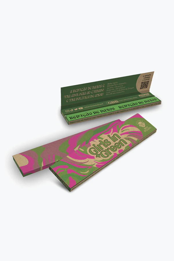 Seda não branqueada, livre de químicos e com goma natural. Embalagem em papel Kraft biodegradável, collab entre duas gigantes do mercado canábico Brasileiro, Bem Bolado e Girls In Green.